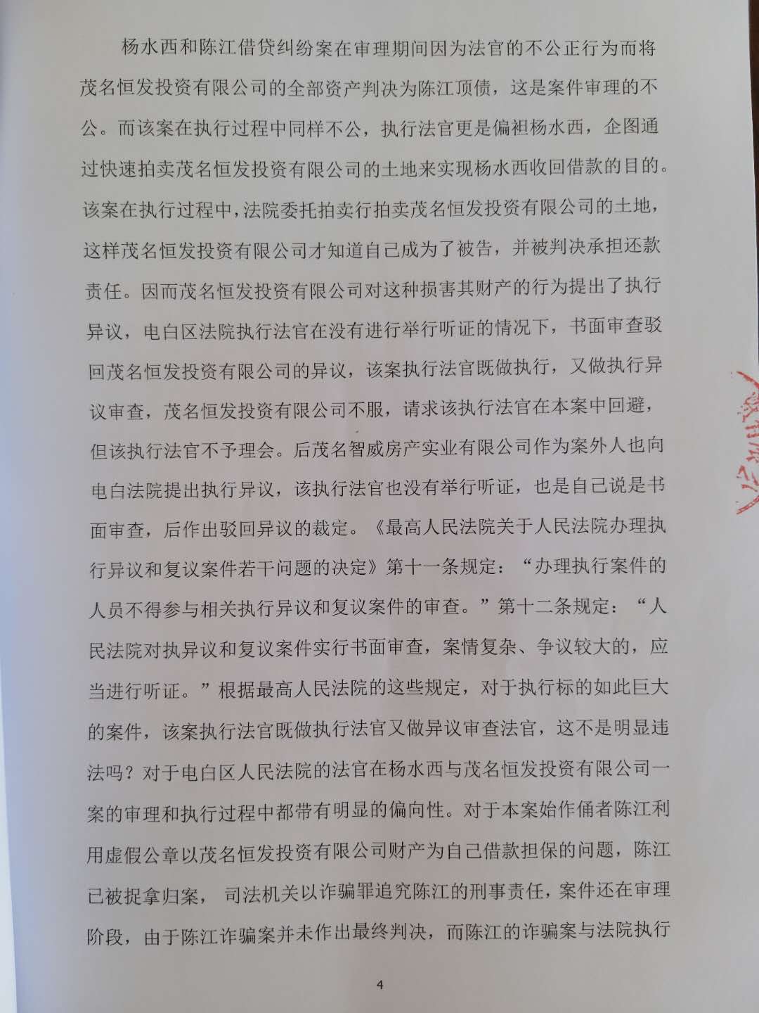 杨水西和陈江借贷纠纷案在审理期间因为法官的不公正行为而将茂名恒发投资有限公司的全部资产判决为陈江顶债,这是案件审理的不公。而该案在执行过程中同样不公,执行法官更是偏袒杨水西,企图通过快速拍卖茂名恒发投资有限公司的土地来实现杨水西收回借款的目的。该案在执行过程中,法院委托拍卖行拍卖茂名恒发投资有限公司的土地,这样茂名恒发投资有限公司才知道自己成为了被告,并被判决承担还款责任。因而茂名恒发投资有限公司对这种损害其财产的行为提出了执行异议,电白区法院执行法官在没有进行举行听证的情况下,书面审查驳回茂名恒发投资有限公司的异议,该案执行法官既做执行,又做执行异议审查,茂名恒发投资有限公司不服,请求该执行法官在本案中回避,但该执行法官不予理会。后茂名智威房产实业有限公司作为案外人也向电白法院提出执行异议,该执行法官也没有举行听证,也是自己说是书面审查,后作出驳回异议的裁定。《最高人民法院关于人民法院办理执行异议和复议案件若干问题的决定》第十一条规定:“办理执行案件的人员不得参与相关执行异议和复议案件的审查。”第十二条规定:“人民法院对执异议和复议案件实行书面审查,案情复杂、争议较大的,应当进行听证。”根据最高人民法院的这些规定,对于执行标的如此巨大的案件,该案执行法官既做执行法官又做异议审查法官,这不是明显违法吗?对于电白区人民法院的法官在杨水西与茂名恒发投资有限公司一案的审理和执行过程中都带有明显的偏向性。对于本案始作俑者陈江利用虚假公章以茂名恒发投资有限公司财产为自己借款担保的问题,陈江已被捉拿归案, 司法机关以诈骗罪追究陈江的刑事责任,案件还在审理阶段,由于陈江诈骗案并未作出最终判决,而陈江的诈骗案与法院执行茂名恒发投资有限公司的财产有非常密切的关系,而法院拍卖的土地是特定物,如果该土地被拍卖将造成茂名恒发投资有限公司极大的损失,为何法院那么着急地拍卖这块土地呢?茂名恒发投资有限公司对此非常不理解。但这个拍卖案最终却因为杨水西与陈江合谋串通一气瞒着茂名恒发投资有限公司全体股东私刻公章用茂名恒发投资有限公司作为借款担保人为茂名恒发投资有限公司及其股东陷入了破产的境地,法院准备在2020年7月28日对恒发公司在东阳北街13号土地进行拍卖,对此,电白区法院是否应当慎重处理呢?而对于杨水西这种职业放贷人,司法机关是否应当依法追究其法律责任呢?对此,我们只能期待,期待得到一份公正和正义,还受害人一个公道。
