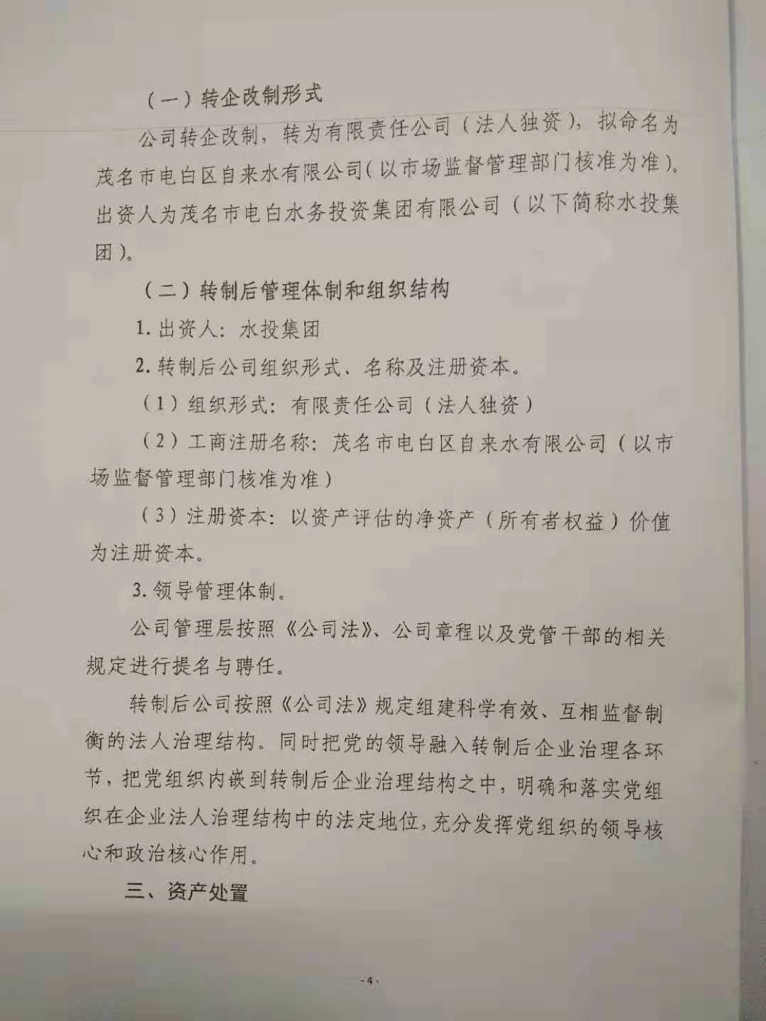 茂名市大电白区所存的事业单位里唯一响应国家政策。事业单位改为企业!事出有因:因在2014年咱们的已升迁刘区长已把电白区自来水公司偷偷承包给了北京首创集团!开始做出几个破产方案来赔偿给职工。可刚好国家来个事改企政策,这可正好借这个处理!