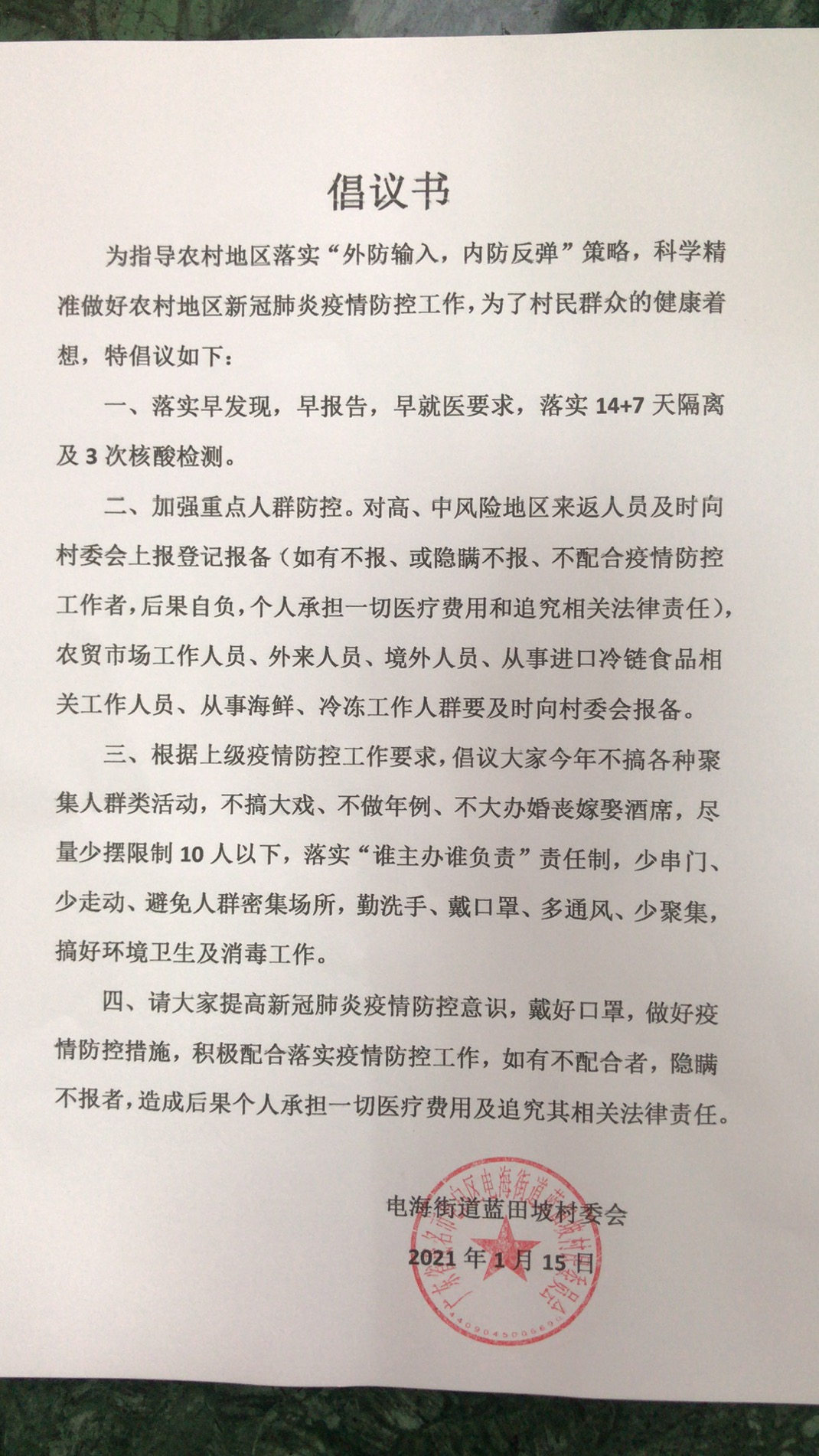 电海街道蓝田坡村委会关于新冠肺炎疫情防控工作的倡议书