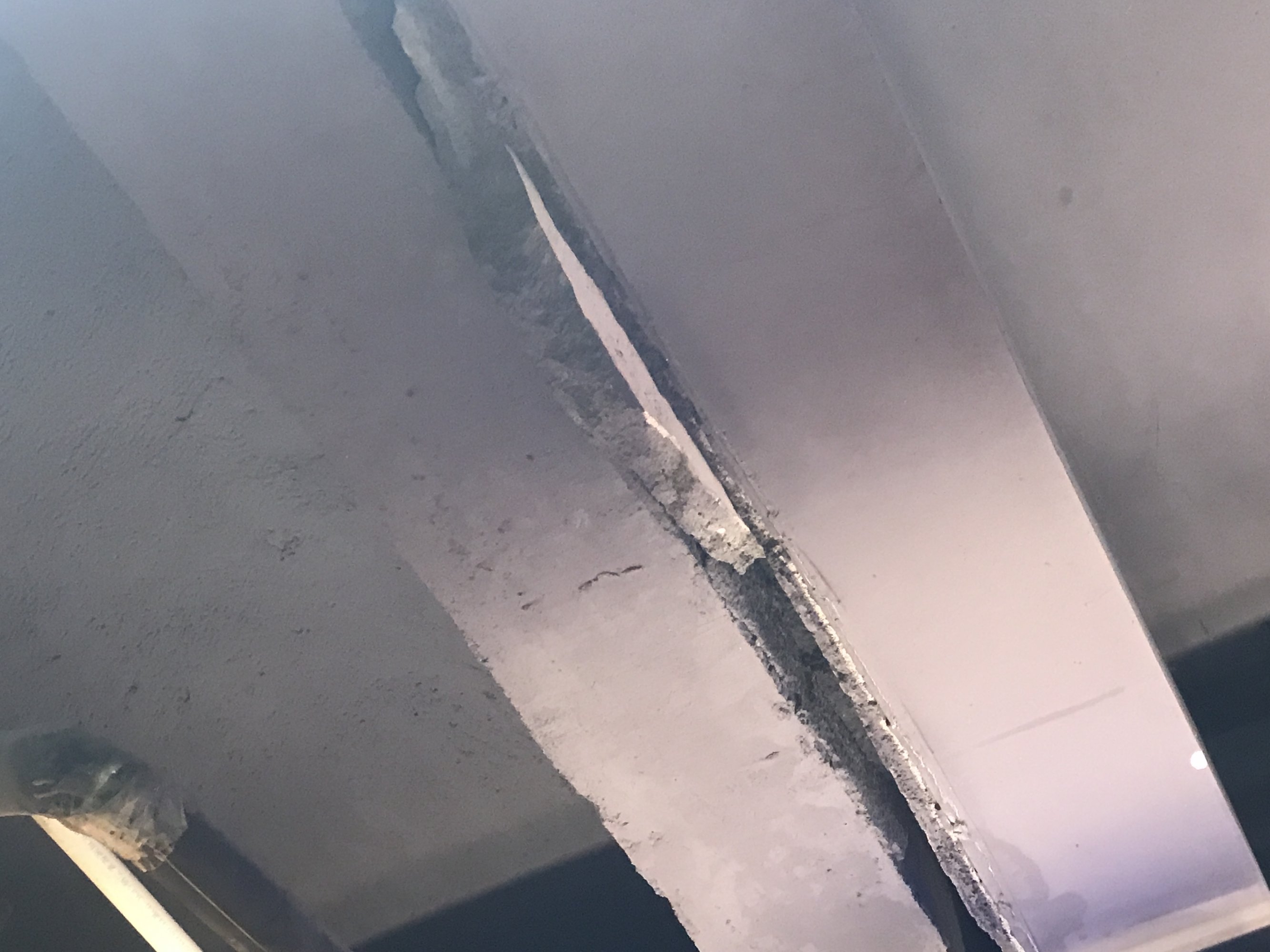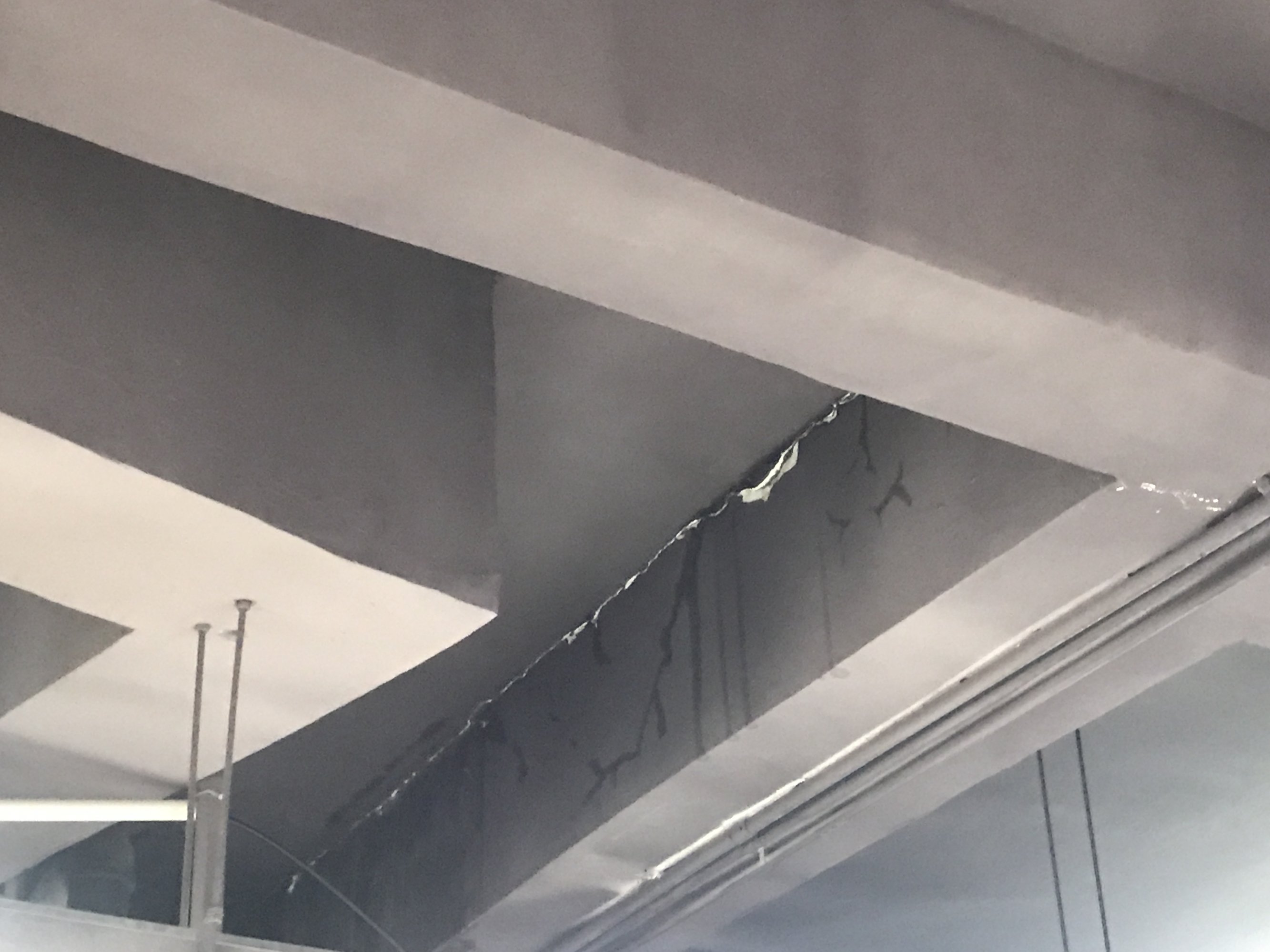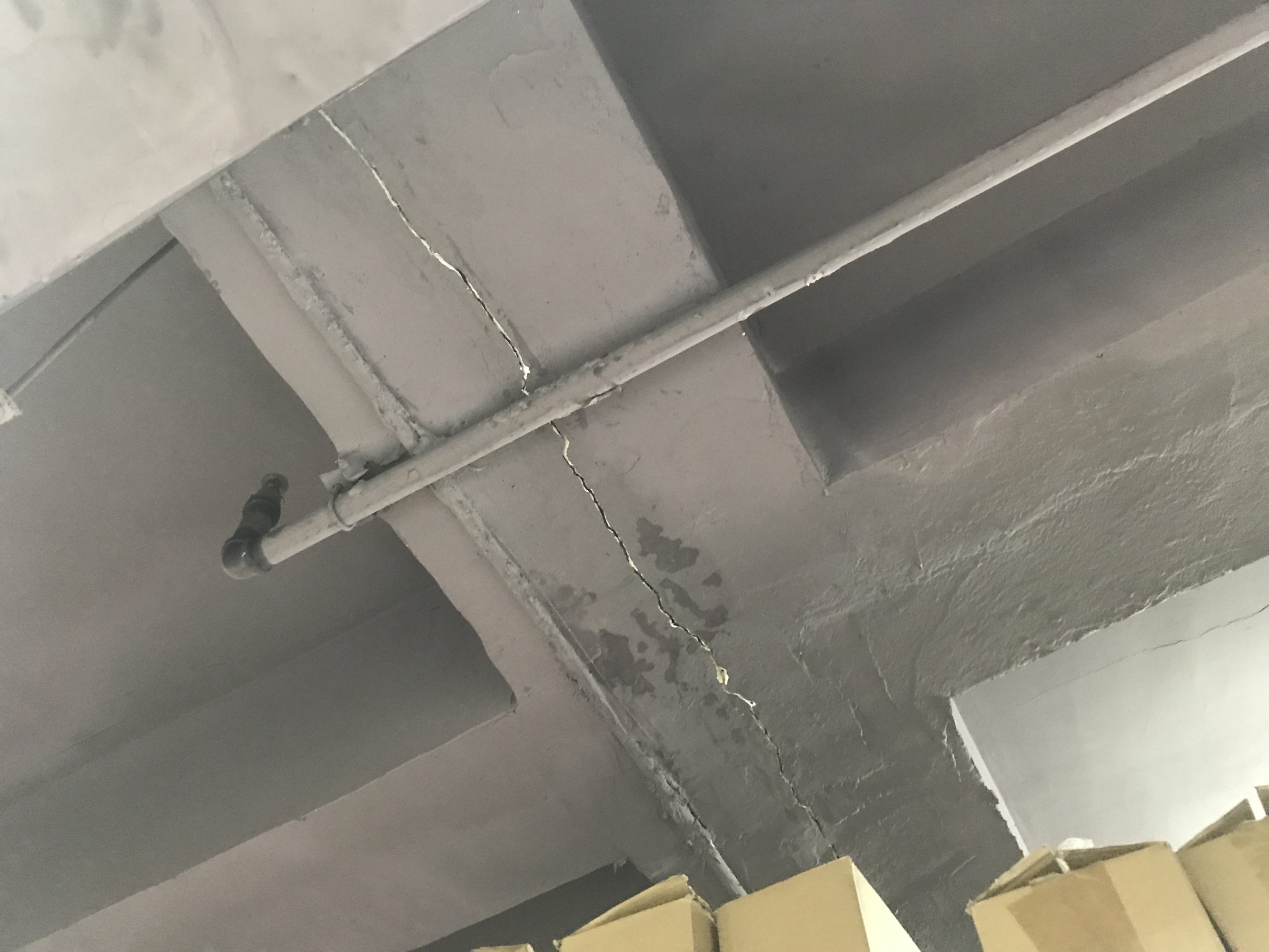 中间夹着灰屎的应该是伸缩缝,但还有很多好像楼板梁边也有裂痕,看着就怕怕了。