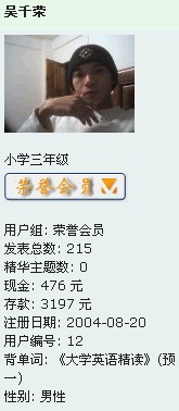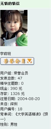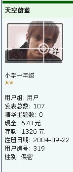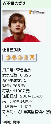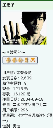 非你不娶 本人出租,有意者Q我 荣誉会员 注册 2004-08-26 消息 17,850 反馈评分 0 点数 61 年龄 37 2005-09-26 #68 那些前一百名编号的大部分给浪费了 偶是珍稀动物哈