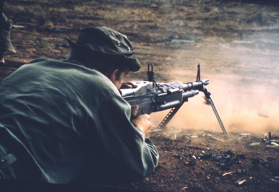 前排左二个带两脚架的是69式反坦克火箭筒,后面战士背上黄色的筒,装的是所配的弹弹。