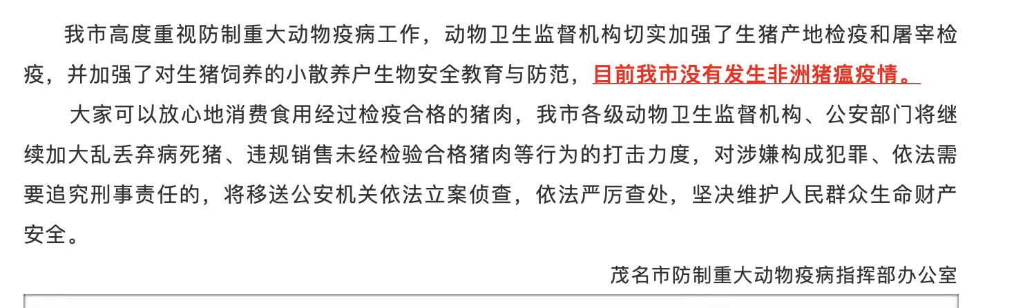 不知道我们村里,有没有人养很多猪的,养殖户可能对非洲猪瘟疫情感受较深。郭家在2017年时就已经知道俄罗斯有非洲猪瘟,可是在18年毛衣战后因为美国关税贵了,居然还去俄罗斯疫区进口猪肉。结果18年12月左右东北地区发现非洲瘟,不及时处理。到19年3月全国连海南都有非洲瘟。我们茂名电白区作为养猪大户区,非洲瘟造成损失惨重,路边河道四向是死猪。可在19年4月茂名政虎,居然公告茂名没有非洲瘟。那么表示郭家说感染非洲瘟的可以最高赔偿1200元的,茂名就沒有可以领取,全部由农户承担。可是纸包不住火。前几天由邻市湛江出口到香港的肉猪,验出有非洲瘟。而茂名比湛江死猪更多更严重。但是市政虎说沒有,我们只能说,他们是怕报告有非洲瘟了,自己又没有能力处理,想保住官帽还是不报了。以后不想处理问题的是下层的贪官污吏。直到2019年5月16日郭家农业农村部,郭家顶层,发布了一条更可怕的信息,以后非洲瘟只能由农业农村部和市场监管总局按有关程序及规定统一发布信息。其他单位和个人不得擅自公布非洲猪瘟病毒检测相关信息。那么就是说不是市里要隐瞒非洲瘟。而是更高层次的问题。只能说问题越来越严重。