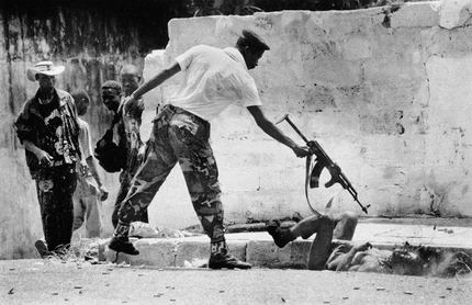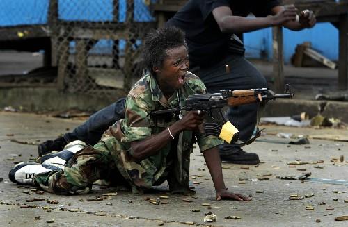 一名利比里亚政府军士兵奋力保卫一座桥梁