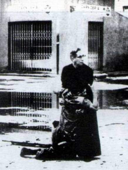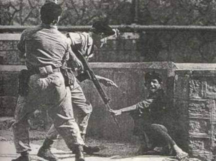 委内瑞拉一名前往平息叛乱的政府士兵被击中,伯迪拉神父一面抱着他为他做临终忏悔,一面紧张地观察追兵是否会突然到来