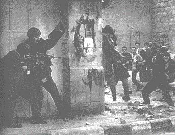 一群巴勒斯坦人向以色列士兵投掷石块,两名以色列士兵退至墙后,躲避投掷物,同时向这群巴勒斯坦人开枪,前面的巴勒斯坦人已被击中。