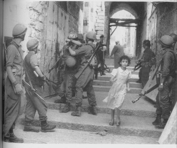 一个以色列士兵在哭泣,他的同伴安慰他;一个巴勒斯坦人在向远处走去,一群士兵警惕看着他的背影;一个小女孩从灰色的画面中穿过,没有人注意到她漂亮的脸孔和天使般的白裙。