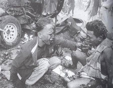 1967年4月,也门仍旧处于英国的控制之下。但法律和秩序已只能依靠军队来加强了。由于不久前有17名英军被叛乱者绑架并杀害,因此镇压叛乱的英军变得粗暴异常。无论如何,用军队来对付平民百姓总不是件很光彩的事,它通常是统治即将陷入崩溃的先兆。图为一名受到英军威胁的亚丁男孩恐惧地蜷缩成一团。旁边的摄影记者爱莫能助。(也门亚丁.1967)