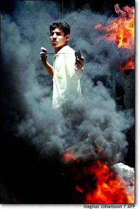 中东在浓烟闪光》 一个巴勒斯坦青年躲在燃烧着的路障后面,用他的小弹弓向以色列士兵射击