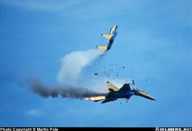 1996年在英国费尔福德空军基地进行飞行表演时,两架米格-29相撞的瞬间