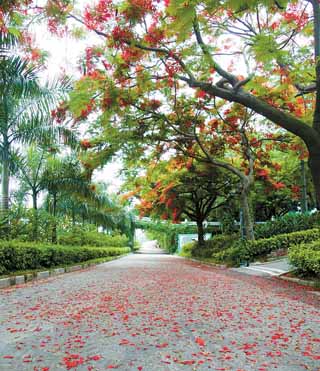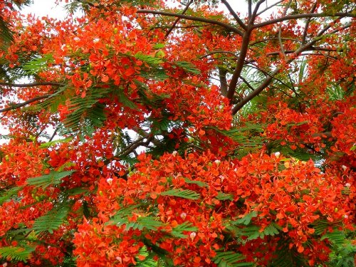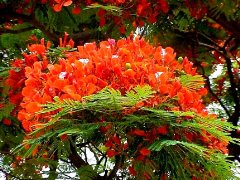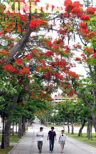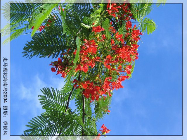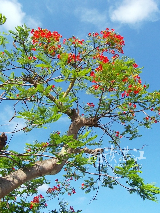 每当早晨回校,看到树下的地上撒满凤凰花时,就象浦了一层红地毡,鲜艳奇目,大家都舍不得向前踏上半步;大风一起,把整个校园都染上了红色。。。。好不美艳!