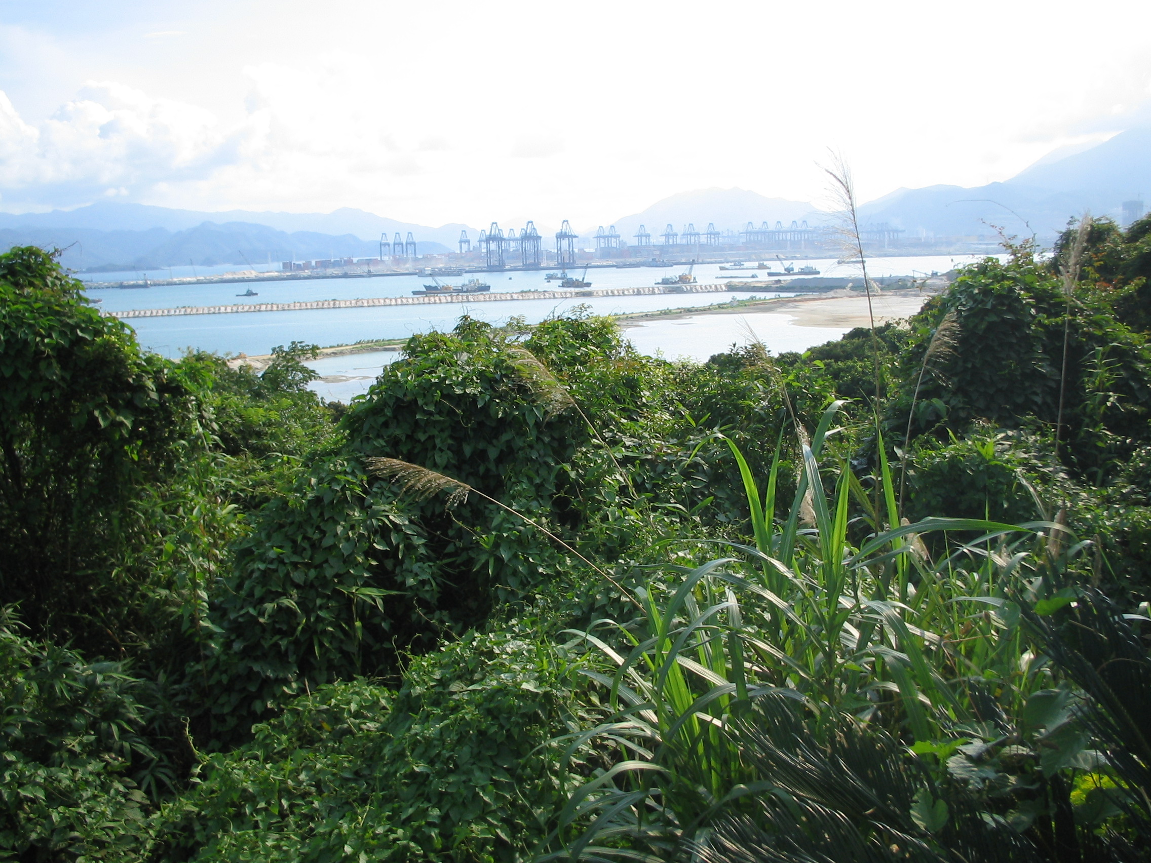 停泊在大鹏湾,等待到盐田港卸货的10万吨集中箱船。