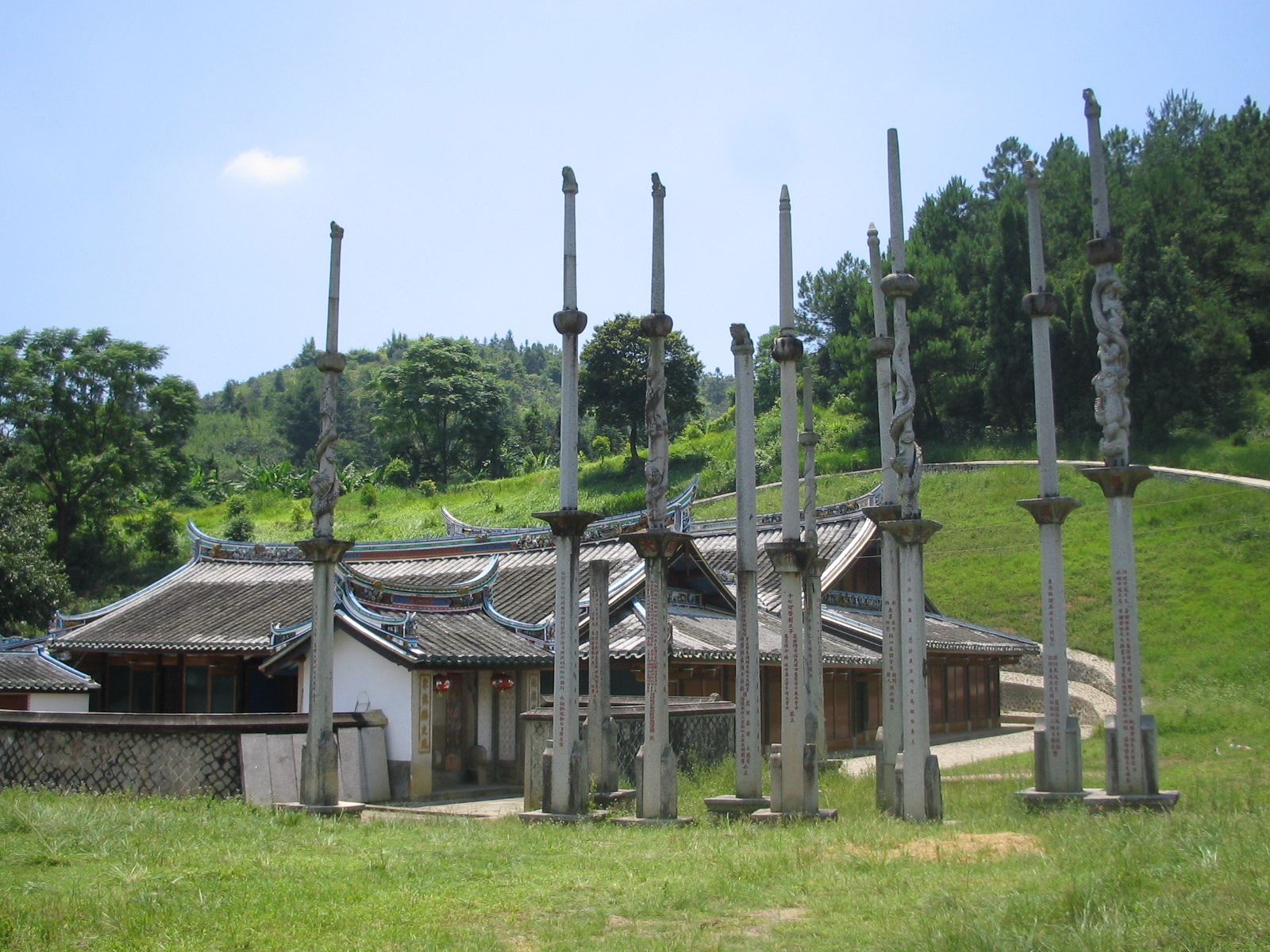 穿过两环两重大门,便是全楼的核心:祖堂。这个宽敞明亮的祖堂大厅,像是一个现代化的多功能大厅,可供全楼人婚丧喜庆、聚会议事、接待宾客以及演戏观戏。正门两边耸立四根圆形大石柱,象征灵魂接天的意思,屋顶呈三角形,酷似古希腊的雅典神庙。土楼虽土,却是外土内洋,中西合璧。这些石柱高7米,周长1、5米,每根重达一万余斤,八十多年前没有机械作业,全靠人工运进楼内并架构起来,实在令人叹服。