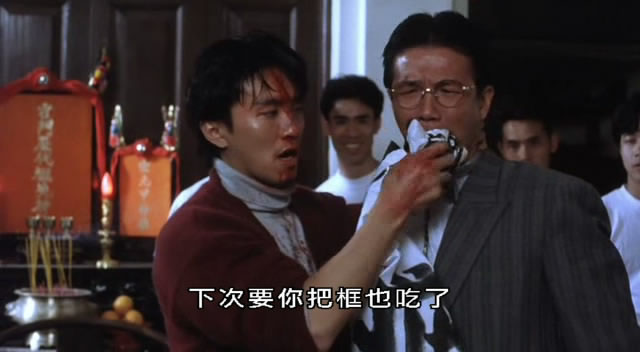 周星驰:想偷机啊?(撕了一大块纸塞到太保嘴里)这次要你吃纸而已,下次要你把框子都吃了!