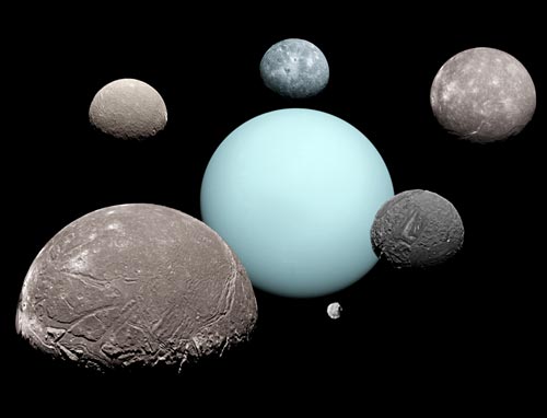 它们自然分成两组:由旅行者2号发现的靠近天王星的很暗的10颗小卫星和5颗在外层的大卫星。