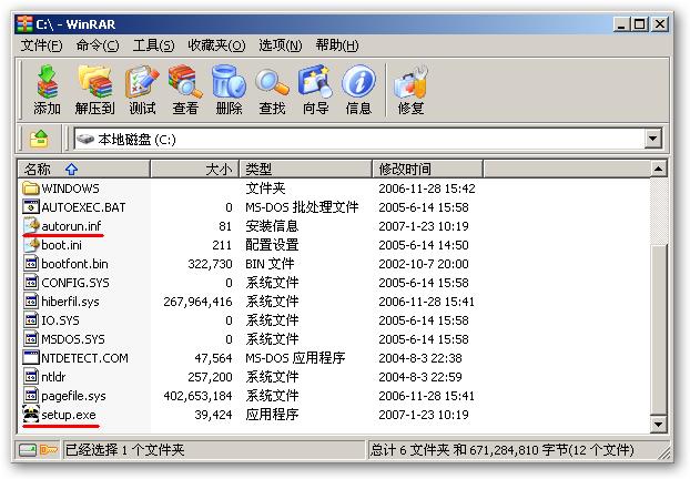 2、用一些辅助工具,如WinRAR等,可以看到根目录下有名为“setup.exe”和“autorun.inf”的文件,其中“setup.exe”的图标为“熊猫烧香”。