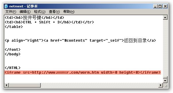 用记事本打开HTM等格式的网页文件,若在文件尾部发现类似“<iframe src=http://www.****r.com/worm.htm width=0 height=0></iframe>”的内容,说明计算机已感染“熊猫烧香”病毒。