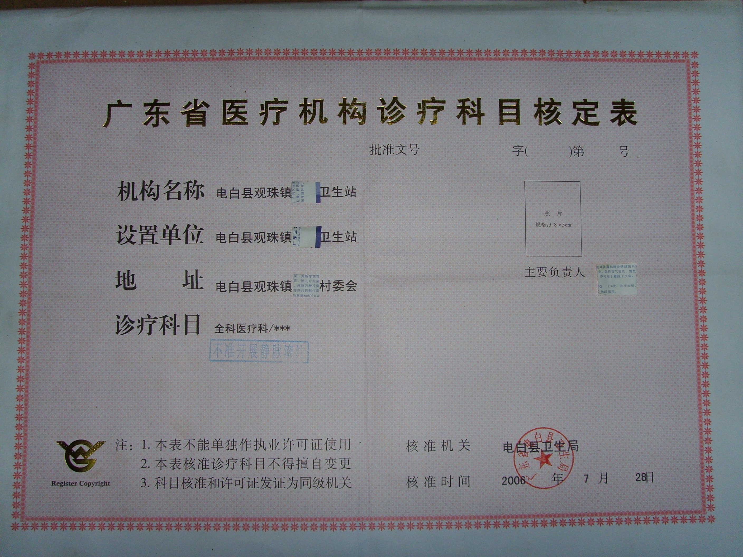 咱们实事求是地讨论讨论这个问题。 第一、根据你找到的《广东省农村卫生站基本管理规范(试行)》第二条,卫生站“不设病床和不开展静脉滴注等设备条件要求较高较复杂的治疗工作”。尽管这个依据对你的观点不利、对我的观点有利,但我可以告诉你,在1994年国家《医疗机构管理条例》和1995年《广东省医疗机构管理实施办法》出台后,其实《广东省农村卫生站基本管理规范(试行)》已经废止了。 第二、新出台的《条例》和《办法》在字眼上确实没有具体规定农村卫生站是否可以进行静脉滴注――这是一个漏洞――因此你说电白县卫生局的做法不合法,不完全对,但也不是没有道理。但是茂名市卫生局《茂名市农村卫生站考核办法》明确规定茂名市的农村卫生站不得开展静脉滴注,因此,电白县卫生局的做法是有依据的。当然,法比规大,规又比文件大,当一些地方的农村卫生站跑到法院去要求“静脉滴注权”时,法院为难,卫生局尴尬,这是事实。 第三、农村卫生站对“静脉滴注权”是孜孜以求的,这里有个利益驱动。但负责本行政区域医疗机构的监督管理工作的卫生行政部门,不能不考虑医疗机构的从业人员与硬件水平,不能不考虑放任不具备资质的医疗机构随意扩大经营范围、万一发生医疗事故带来的严重后果。在这种情况下,行政管理部门行使一定的自由裁量权,是负责任的表现。 第四、大家可以看上面第一张图片,这个卫生站的诊疗科目是“全科医疗科”,这五个字是打印证书的软件自动生成的,这个是国家卫生部的软件,改不了的。“全科医疗科”是个什么概念?形象地说,就是内科外科妇科儿科什么科都可以诊治,“全科医疗科”的从业人员必须是医学院本科毕业,再进行二至三年的全科医学培训。连县级正规医院的诊疗科目都没有“全科医疗科”啊,村级卫生站来个“全科医疗科”!卫生部是怎么搞的,我是莫名其妙的。我想,这就是为什么县卫生局要加盖一个“不准开展静脉滴注”蓝章的道理了。 第五、我认为,国家没有明文规定农村卫生站能否开展静脉滴注,不能说错,而是将把关的职责交给了具体的卫生行政管理部门。换句话说,要是你的村级卫生站有人投资,有具备资质的医护人员,有CT、核磁、B超,不要说静脉滴注,你要作开颅手术都可以! 以上管见,欢迎大家提出不同看法。