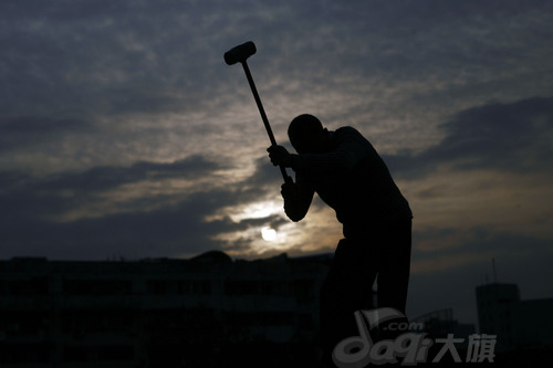 这样的工作如果是没干过体力活的人 ,干一会就吃不消了。我们却不会偷懒,因为我们没有工资.每天的收入,就是把打碎的桩里面的钢铁以8毛一斤卖给包工头,多劳多得.包工头再以一块一斤卖给别人. 挥锤,挥锤,咬着牙再挥锤。。。。。曾经的激情,理想,斗志,锐气就象锤下的石块,碎开四溅。 附图:挥锤