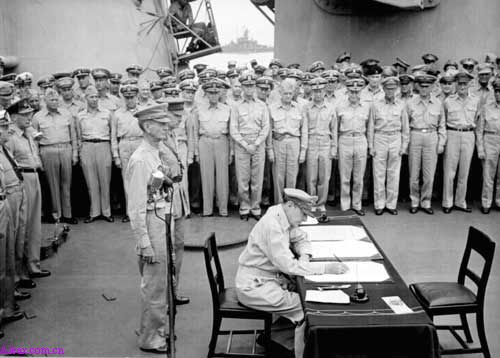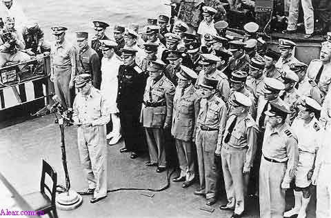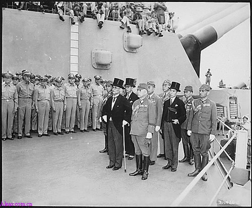 盟军最高统帅麦克阿瑟与同盟国各国代表在签署降书仪式上接受日本投降