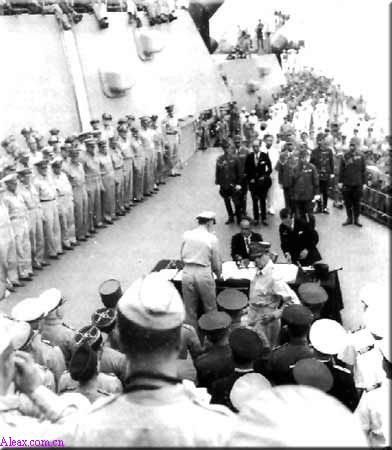 1945年9月2日上午9时04分,受降仪式在停泊于日本东京湾的美军战列舰“密苏里”号上举行。日本外相重光葵和日军陆军参谋总长梅津美治郎等日本投降代表团11人代表日本向盟国投降。由美国、中国、英国、苏联以及其他对日作战的战胜国受降。