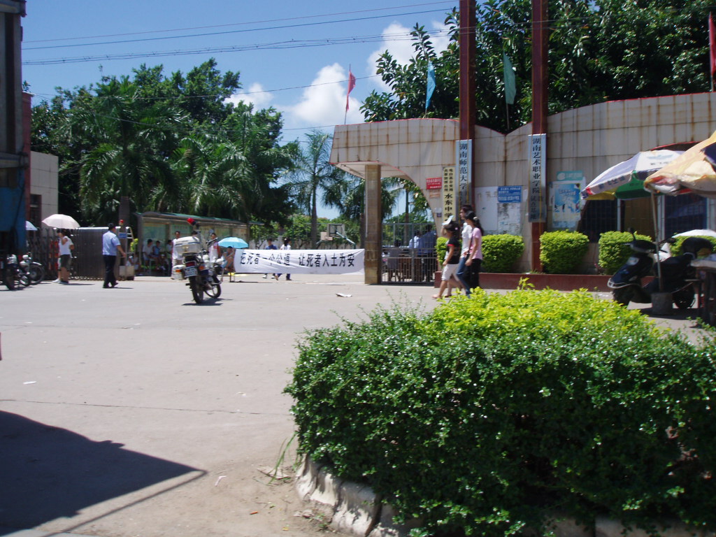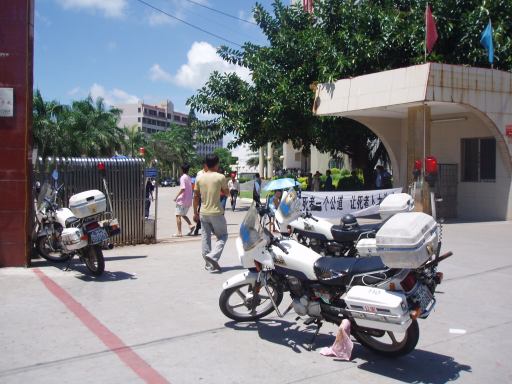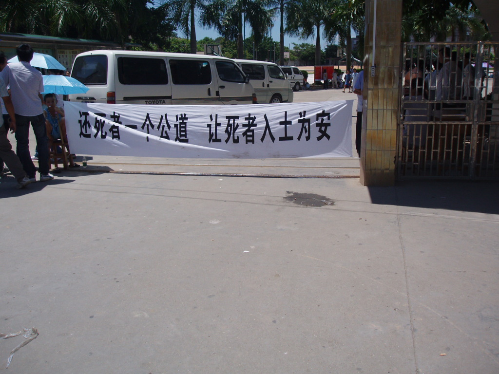 学校门口拉着一条横幅:“还死者一个公道,让死者入土为安。”