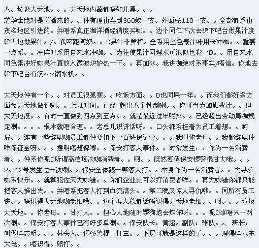 在这里说句真实话。大天地己经变质,如果你不是粉友最好不要进去。前几天应一朋友邀请去大天地大厅玩,当时的情景难以入目,坐我隔离台的几个男人拿着白白的一袋白粉,光明正大的在吸,随处都是那些人,还时不时的眼盯盯的看着我们几个女的,当时我吓的差点哭出来,啤酒都不要了走为上计,还时不时感觉后面有人跟着,以后打死我也不去那地方了,如果你不信你可以去参欢一下,我本不想说这些,但这是事实。
