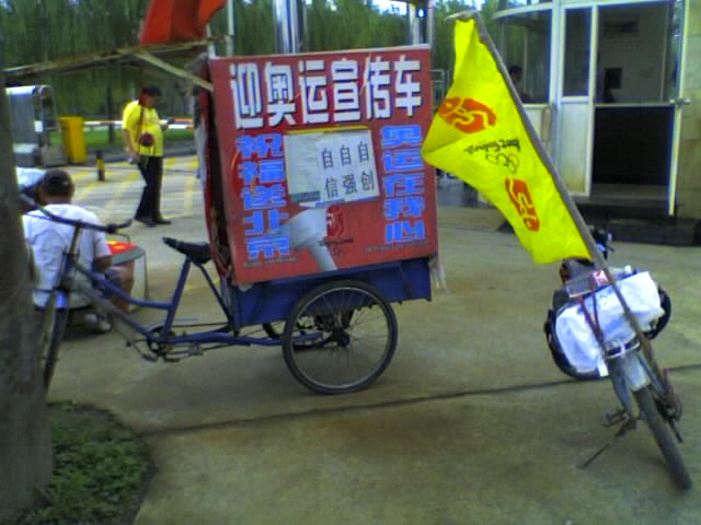 7月15日晚上十点多,在北京房山区往天安门的路上,一位小车车主看到他们及插在自行车上的红旗,将小车停在他们前面不远处的一个路口,等他们到了让他们停了下来,然后给他们递了几瓶水。他们喝完水后,车主与他们交谈起来。得知他们要到北京天安门后,他主动提出为他们带路:“这里离天安门还有十几公里,现在那么晚了,你们又不认识路,我打着车灯慢慢开车,你们在后面跟着我会快点。”把他们带到天安门后,他递给他们一张名片,说:“你们遇到什么困难就找我,我会尽量帮助你们的。”