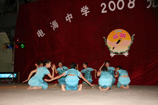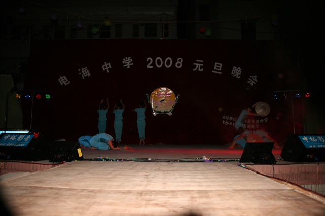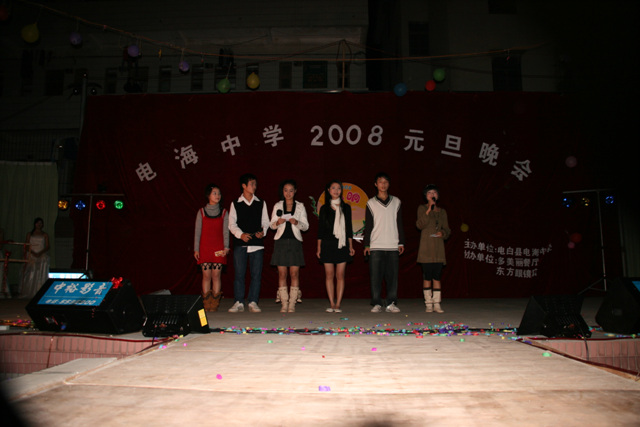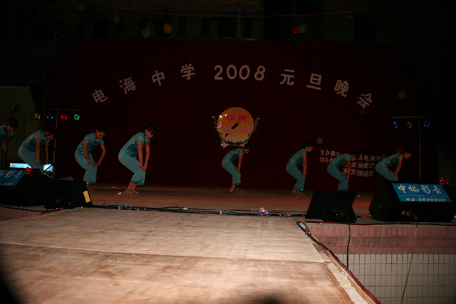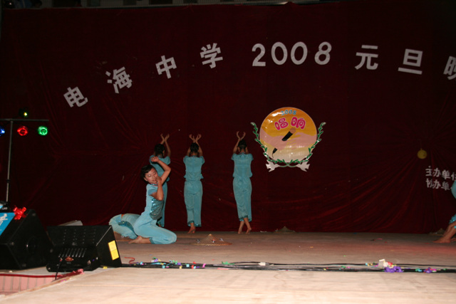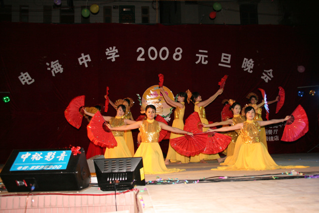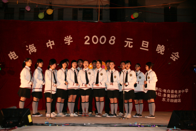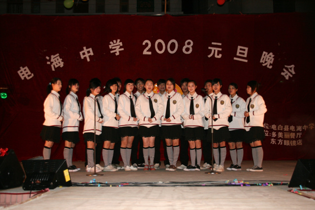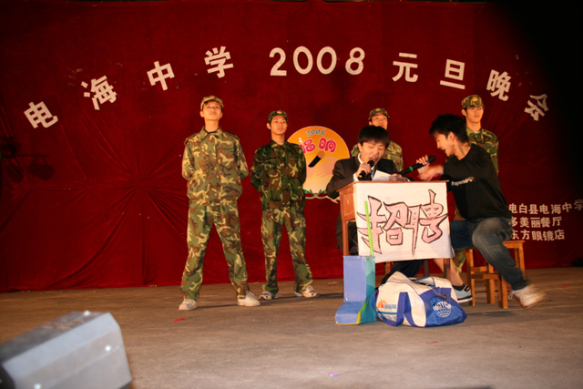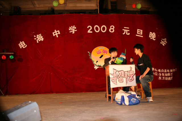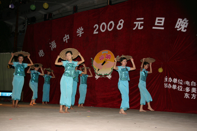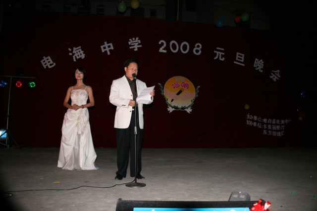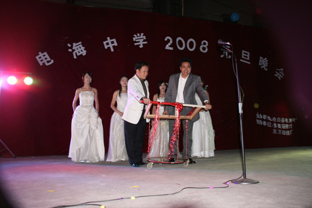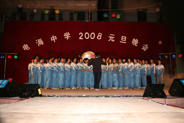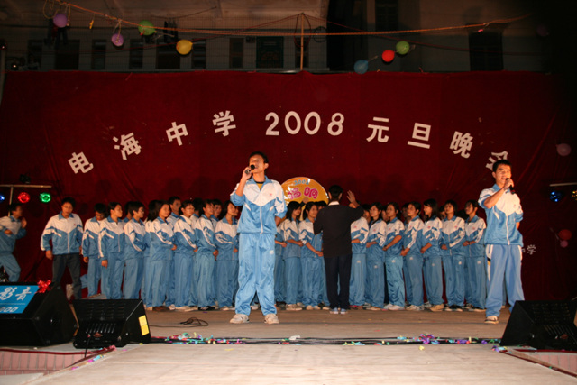 2007-12-24 作为一名神秘嘉宾参加了电海中学2008元旦晚会,该晚会是由该校学生自编自演的晚会,节目非常精彩,值得观赏。 在当今以高考分数挂帅的紧张时刻,能由学生自编自演,彰显了电海中学学生的多才多艺。这些才艺的锻炼,也为他们在以后的高考升学中比别人多了一次机会,特别是走出社会后,也比别人多一点选择。