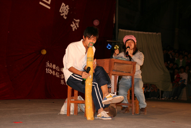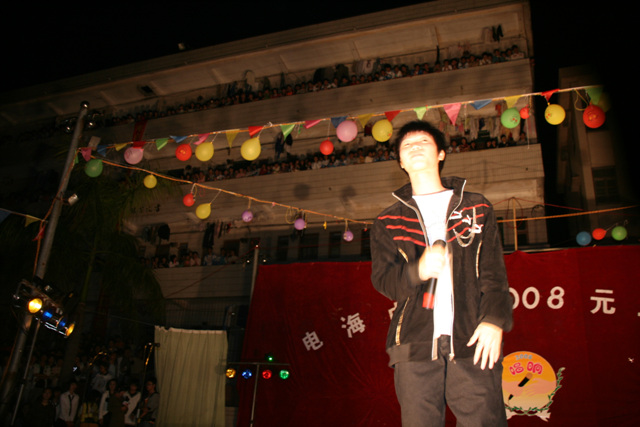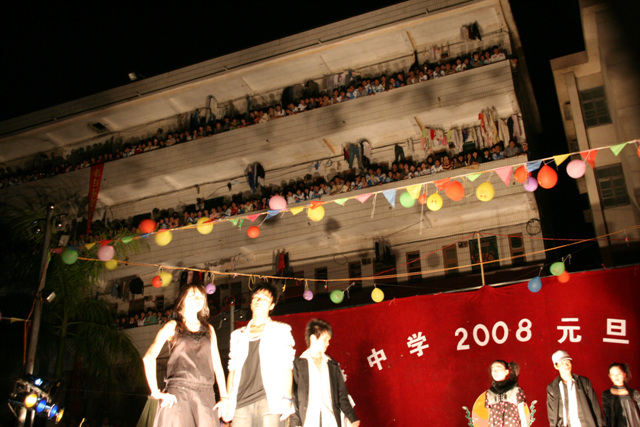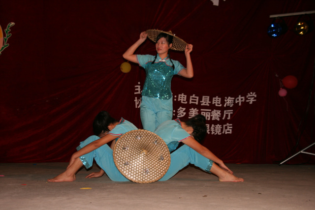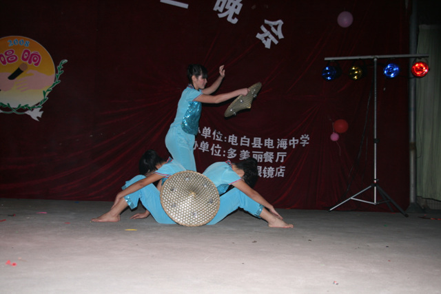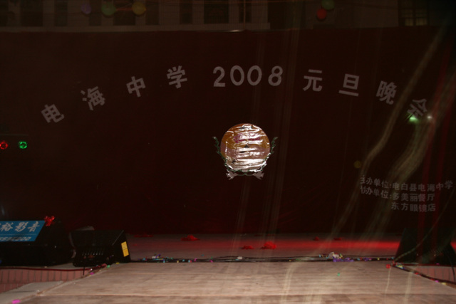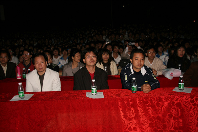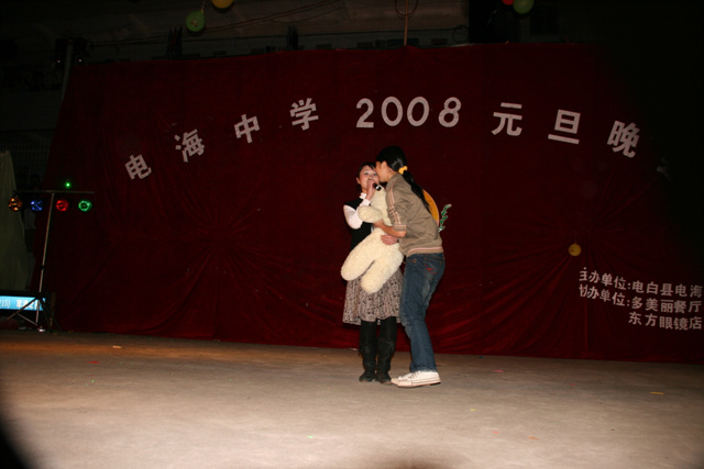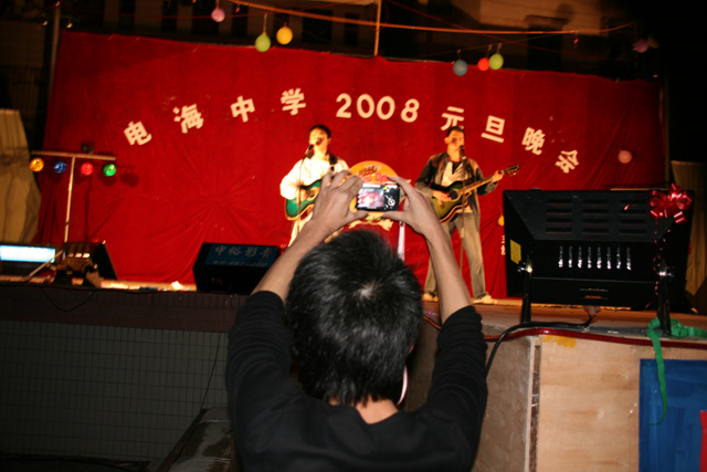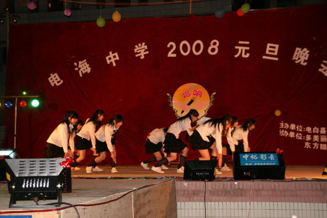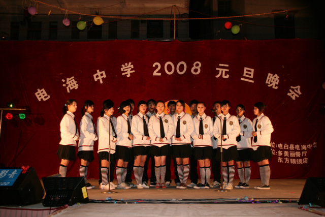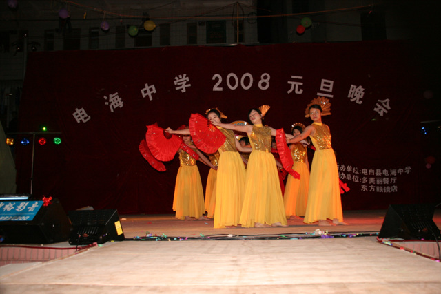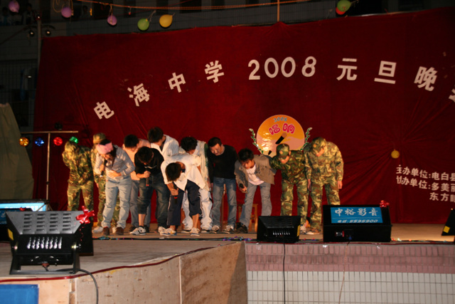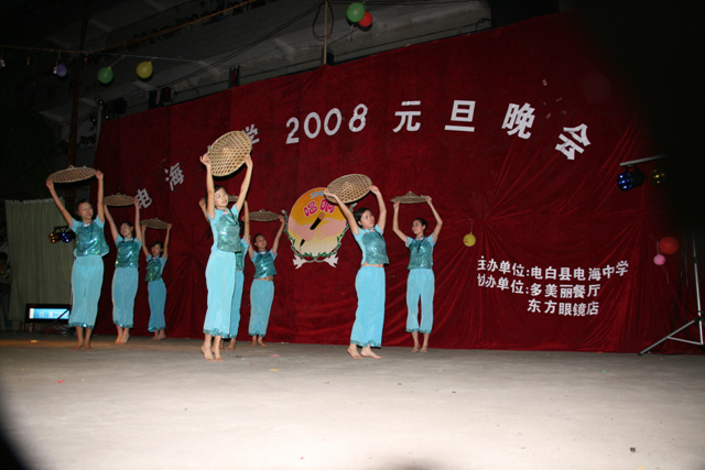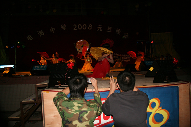 2007-12-24 作为一名神秘嘉宾参加了电海中学2008元旦晚会,该晚会是由该校学生自编自演的晚会,节目非常精彩,值得观赏。 在当今以高考分数挂帅的紧张时刻,能由学生自编自演,彰显了电海中学学生的多才多艺。这些才艺的锻炼,也为他们在以后的高考升学中比别人多了一次机会,特别是走出社会后,也比别人多一点选择。