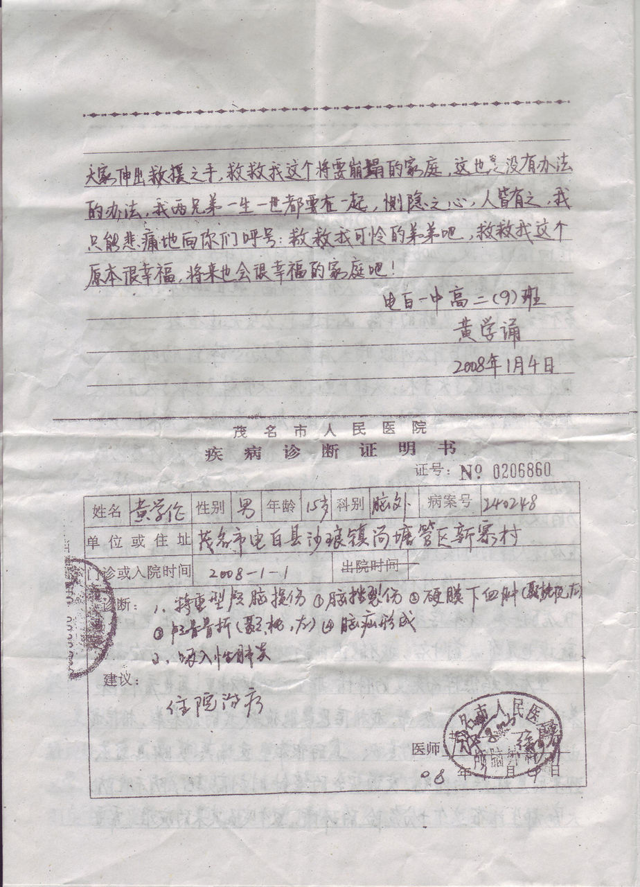 [FONT=宋体]有一个电白中学的学生一月一号被车撞,现在在茂名人民医院脑外科,生命严殆,他今天晚上如果手术做不了他就会死, 我~~~代表电白中学的学生希望大家能让报社的人知道,同时也希望大家能支持,谢谢!!!!!