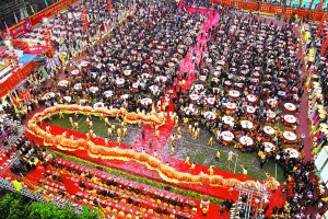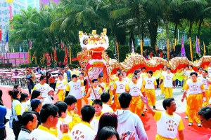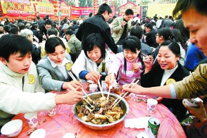 吃大盆菜、舞龙醒狮,昨日福田下沙村热闹非凡,以“深港两地心连心,元宵盆菜迎奥运”为主题的2500席盆菜宴招待海内外来宾与乡亲。