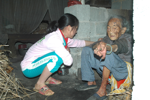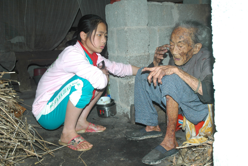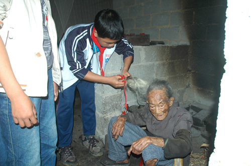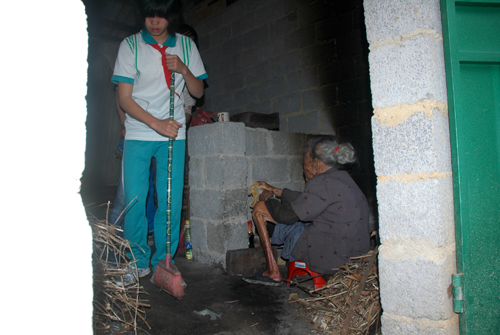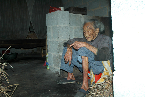 这是一个百岁老人居所的外景,三间老房早已崩塌。现在居住的水泥砖房是她的女儿及乡亲们建造的。 终有一天,我们也会碰到这种情景――贫困、孤独、无依无靠。我们的国家、我们的党很强大,但国家、党的恩泽能否降临于所有的贫困、孤独的人? 老人家100岁了,正在申请领100元/月的生活补助,而以前只有40元。40元?谁愿意孤独?谁都会趁年轻去……,毕竟有儿子的老人就是不一样。
