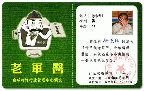 QUOTE(蛙子 @ 2008年04月02日 Wednesday, 07:55 PM) 姓名:蛙子 性别:男 年龄:年年28岁 相貌:非一般美丽 籍贯:电白 身高:172cm 体重:70kg 职务:苦力 爱好:金钱美女 性格:暴躁 月收入:负 相片: [snapback]2179305[/snapback] 地下工作者! 无需通行证,来无影去无踪!