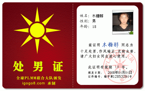 QUOTE(刀母头 @ 2008年04月02日 Wednesday, 12:11 AM) 姓名:刀母头 职务:刀母头集团董事长 性别:男 年龄:28岁 籍贯:广东 身高:178cm 体重:73kg 文化:大学 爱好:做好事 性格:大方,善良。 月收入:888888元 相片:正在打印 [snapback]2178556[/snapback]