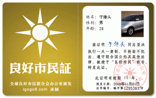 QUOTE(新款子弹头 @ 2008年04月02日 Wednesday, 03:02 PM) 与时俱进也来报个名。 姓名:新款子弹头 职务:水区国际公司董事长职业司机 性别:男 年龄:25 籍贯:广东 身高:180CM 体重:80公斤 文化:大学 爱好:开靓车 性格:开朗 月收入:6800元(不含津贴) 相片: [snapback]2179019[/snapback]