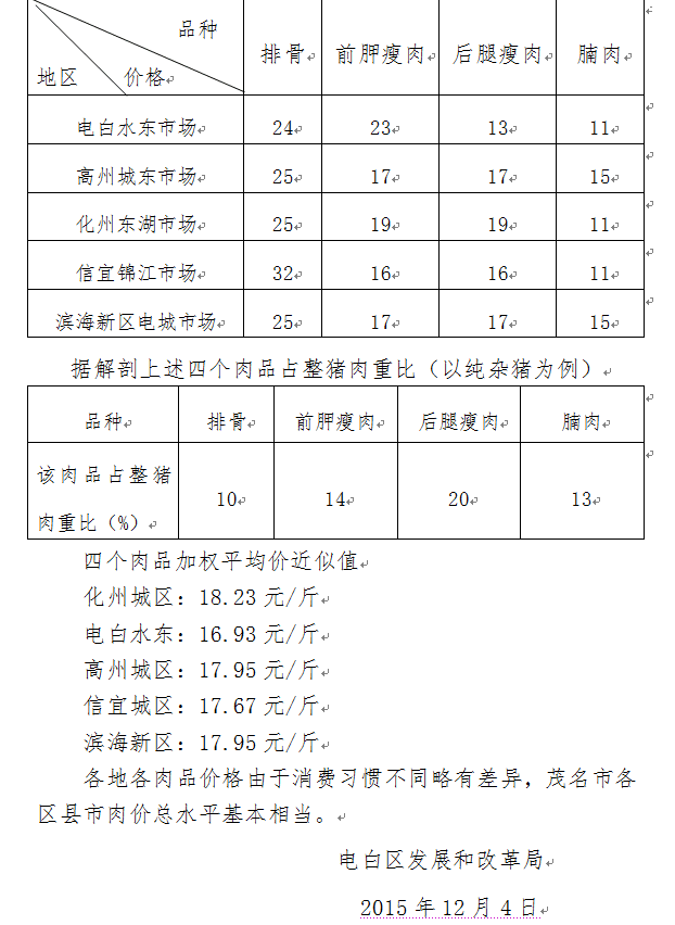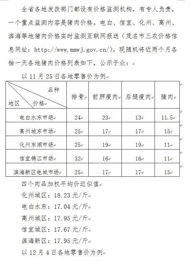 全省各地发改部门都设有价格监测机构,有专人负责,一个重点监测内容是猪肉价格。电白、信宜、化州、高州、滨海等地猪肉价格实时监测互联网报送(茂名市三农价格信息网址:http://www.mmwj.gov.cn/)。现随机将近两个月各抽一天各地猪肉价格列表如下,公示于众:
