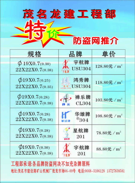 茂 茂名龙建 幼儿园 注册 2008-06-19 消息 2 反馈评分 0 点数 0 2008-06-19 #2 本公司承接范围:专业不锈钢门,楼梯扶手,不锈钢防盗网,铝窗,各类装修工程及基建工程 联系电话:06683106128 13727838581