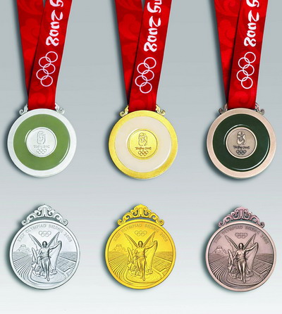 北京奥运银牌、金牌、铜牌(上为背面,下为正面)