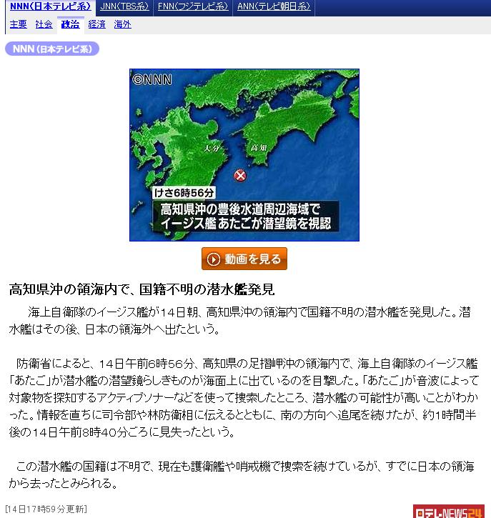 14日上午6点56分左右,在高知县足摺岬海上的丰后自来水周边的领海内,海上自卫队的宙斯盾舰「Atago」确认了国籍不明的潜水艇出潜望镜航行。Atago使用声纳(水中音波探测器)等持续搜索,不过,约1小时半后丢失了。