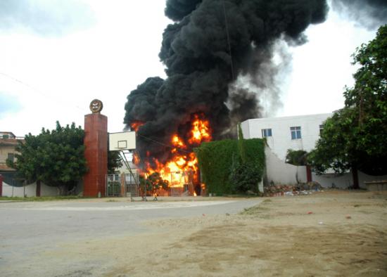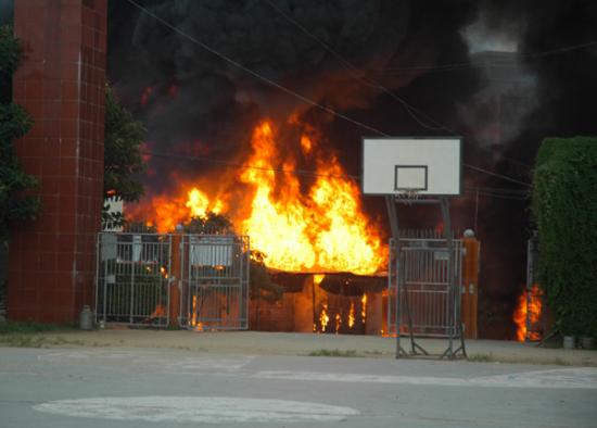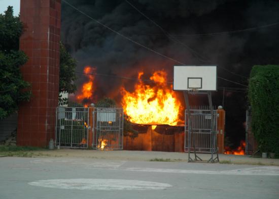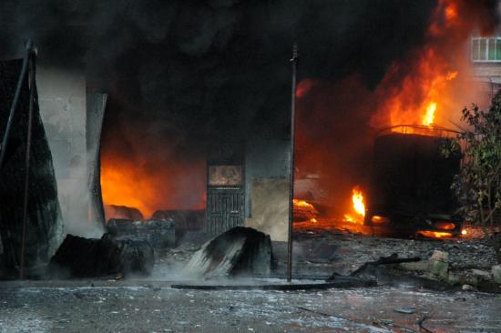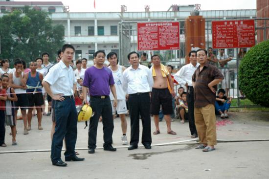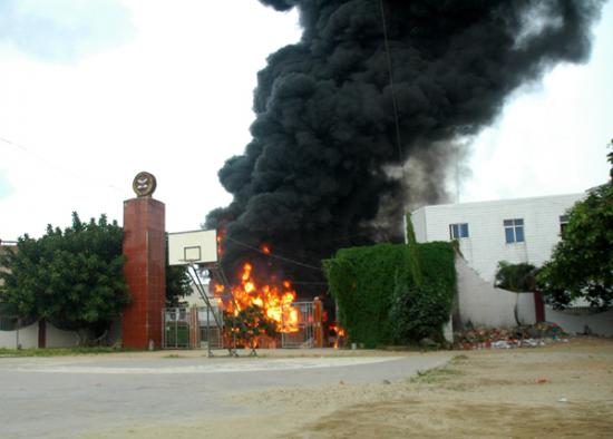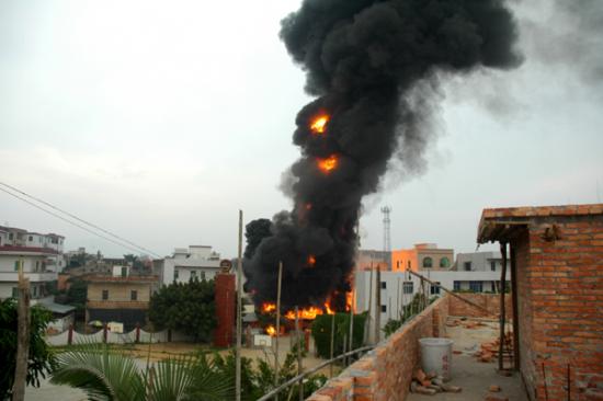记者昨晚7:30赶到现场时,大火已被消防官兵扑灭。发生事故的民居位于大衙中心小学大门口正对面,是一栋三层高的楼房,已被烧得面目全非,四面都是黑糊糊的。一楼面对大衙中心小学的铁门被烧炸得严重变形。朝南的正门前,有一辆烧得只剩下一个油罐的小型油罐车。据目击群众说,当时,此车正在往屋内卸油,不知是什么原因引起火灾。在它南门口前20和50米远的街上,记者还见到两个被烧已扭曲成一团的汽油桶,在旁边围观的群众说,这是爆炸后从屋里飞出来的。