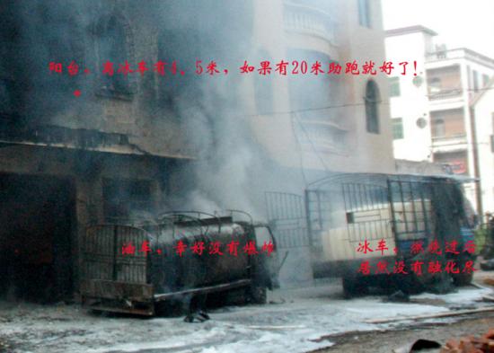 据此屋斜对面仅20米远的一个姓伍的邻居说,当时,他正在家中吃晚饭,突然听到爆炸声,他从二楼窗口往下看,油罐车顶正燃烧着大火,他慌忙从二楼跑下来,走到外面躲避。由于他家离起火的楼房最近,他的房屋也因此受损严重,窗户的玻璃全部被炸烂,一楼的瓷砖被炸脱落,正面的墙头也被烧薰成黑色。