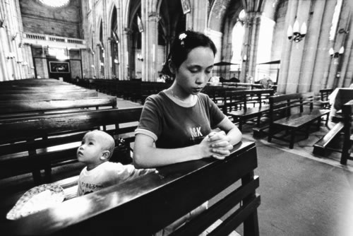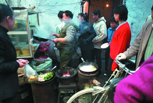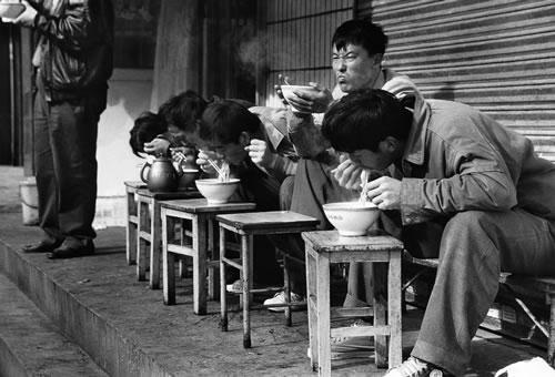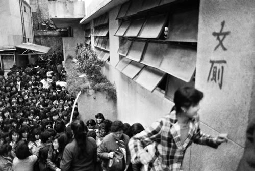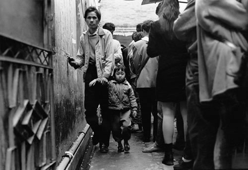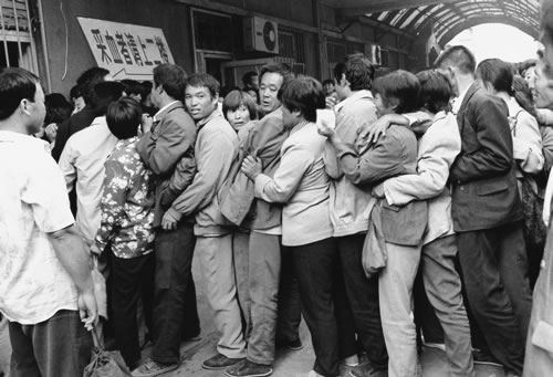 下岗职工排队领取政府发放的救济金