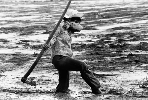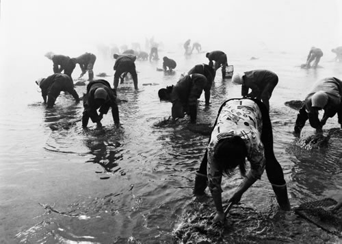 潮水退后,女人们涌到滩上挖蚬子。