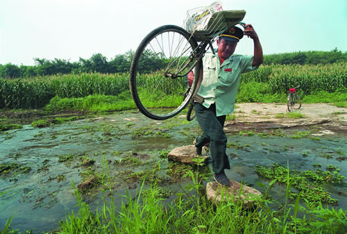 邮递员穿过崎岖村路辗转送信