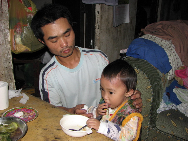 今天夕阳西下的时候,我怀着同情和怜惜心情再次走访小睿坤,当走到通往四中的横街口,楼下是间修理铺,楼上是搭建的简易的屋子,这就是她们的“家”。小睿坤的母亲下梯为开门,沿着昏暗的楼梯,堆满各样杂物。走到楼上,小睿坤爸爸正在喂她吃饭,房间很窄小,容纳不下多几个人,但一家三口可以享受着家庭之乐,正因为小睿坤病了,给他们带来了无限忧伤和痛苦。他们栖身在这里是修理铺老板无尝提供的,但晚上要帮老板看铺头。自从与公公反目后,就租房子住,后来房东知道小孩子患有这个病,都怕有个三长二短,不肯租给他们。