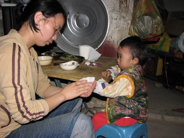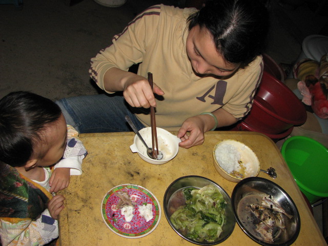 父亲在为小睿坤喂食,母亲在为她擦汗,怕她着冷,这是一幅爱的图章。可怜天下父母心,爱在小屋里升华。
