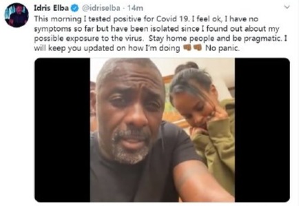 Elba称:“今天早上,我的新冠病度检测呈阳性,我感觉还不错,到目前为止,我没有任何症状,但是自从我发现自己可能感染该病毒以来,就被隔离了。待在家里的人并保持务实,我将向您及时通报我的情况,不要惊慌。”