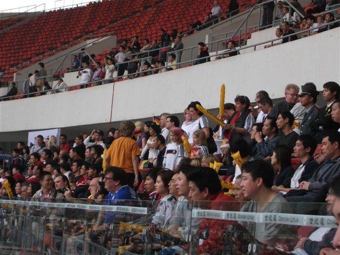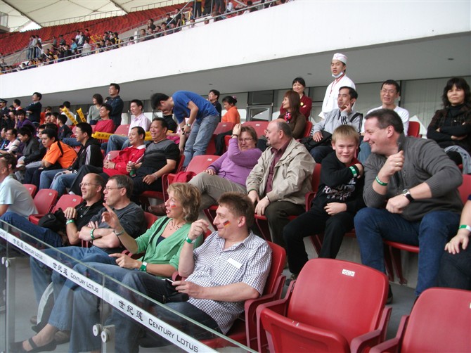 尽管是一群有着明显大肚腩的中年人之间举行的友谊赛,布森克曼射门连鞋一起飞出的一幕更是赚足了笑声……但是中德足球水平的差距还是很快显现,德国前锋伯南在本队第一次进攻组织中就迫使江津犯错先下一城,当时比赛才开始了7分钟。下半时在短短4分钟之内替补上场的佐尔斯滕两度敲开中国队大门,将比分扩大到3比0。但此后德国队“友情”氛围大增,而转换到前场的范志毅开始和郝海东等“衔接”出威力,第70分钟时终于由范志毅射入一球。两分钟后,郝海东也单骑叩关,被对方后卫绊倒在禁区内获得点球,胖墩墩的谢育新上前操刀,稳健罚入,2比3的比分与当晚的融洽气氛浑然一体。