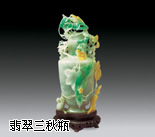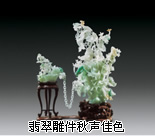 图中的《秋声佳色》,高 20 厘米,是用一块原料巧妙雕制而成。一条链环两端连接花卉瓶和花篮,巧妙如天作之合,整体没有一个接口,要求工艺非常之高,梢有不甚造成断纲,就会使整个作品毁于一旦。作者巧用翡翠料中的黄色、绿色,巧妙地雕出小黄花和大蝈蝈,形神毕肖,令人叫绝。这件翡翠制品用料尽善尽美,用技巧绝处逢生,实乃神来之笔。